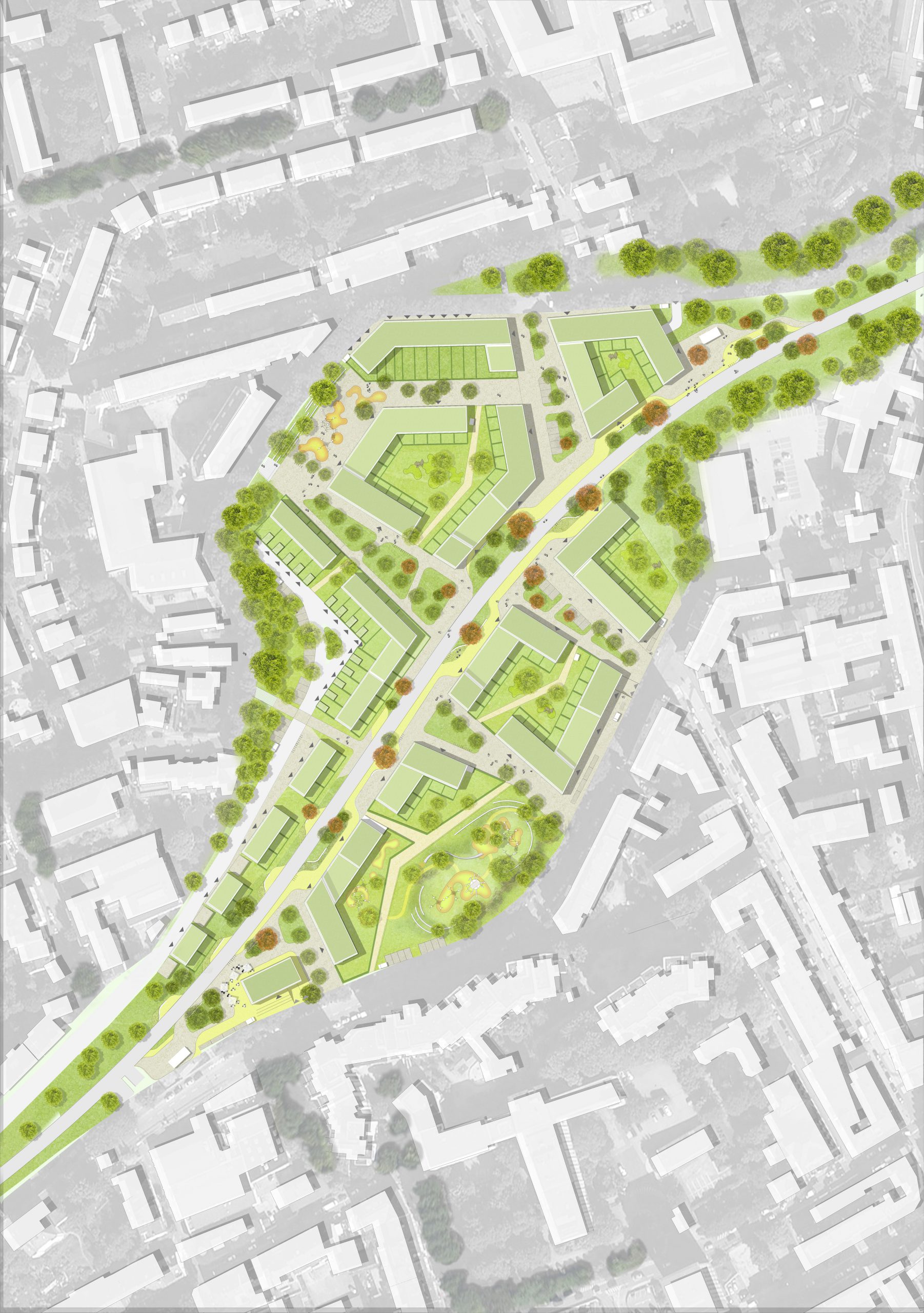 Unser Entwurf für die Entwicklung eines neuen, hochwertigen Wohnquartiers mit passenden Freiflächen, einem Spielplatz und einer Kindertagesstätte überzeugte die Jury durch seine „robuste, städtebauliche Qualität mit einem gelungenen Mix aus Stadthäusern und Geschosswohnungsbau“.