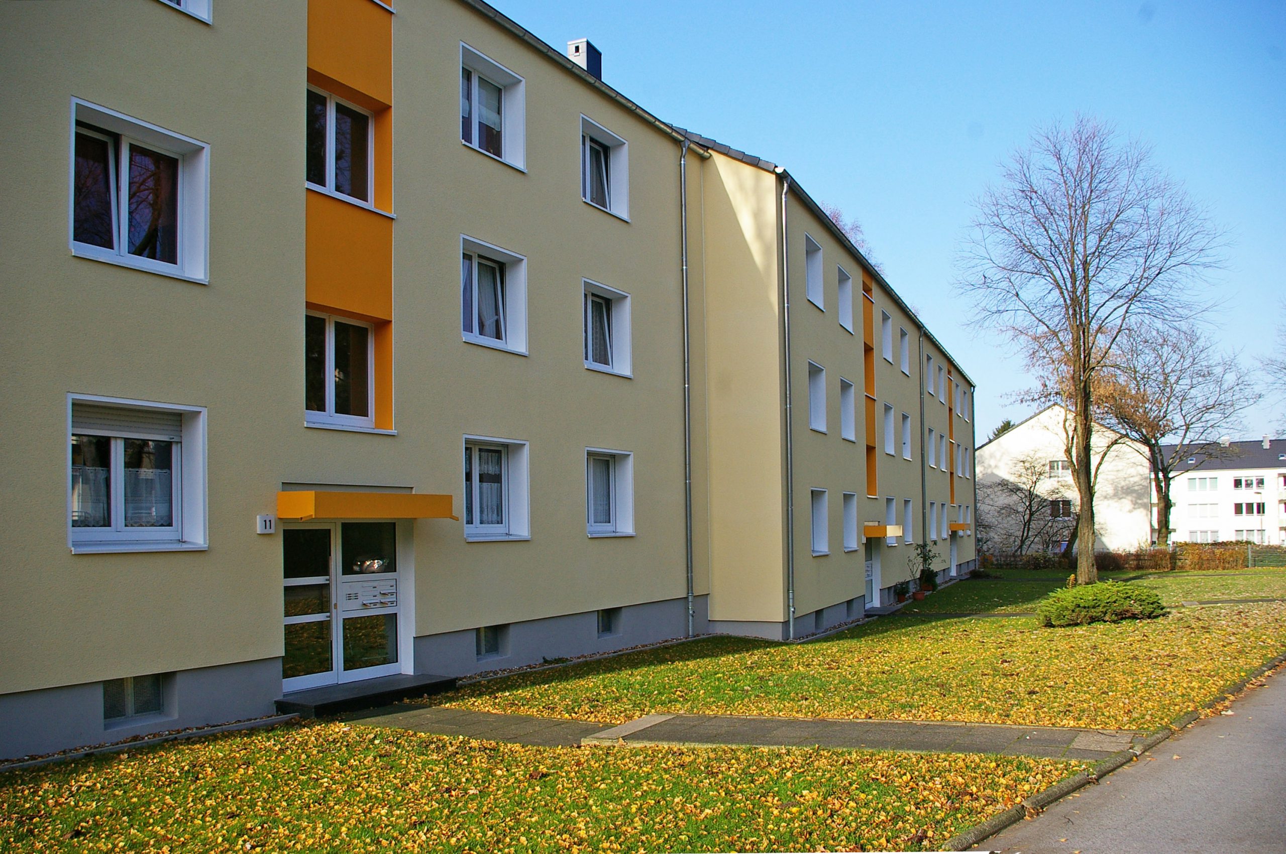 Durch Aufbringen eines Wärmedämm-Verbundsystems, Dachdämmung und Kellerdeckendämmung wurde der Bestand energetisch aufgewertet. Um Wärmeverluste zu reduzieren, wurden sämtliche Fenster erneuert und eine zentralen Heizanlage eingerichtet. Alle Balkone wurden saniert. Die Fassaden wurden durch farbige Betonung des Treppenhaus- und Eingangsbereiche differenziert. So erhält jedes Gebäude einen „individuellen Farbcode“, der es von den Anderen unterscheidet.