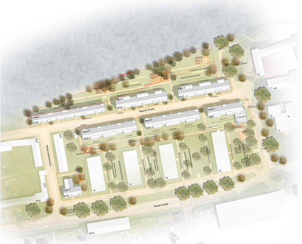 Unser Entwurf greift die vor Ort vorherrschende, straßenbegleitende und offene Bauweise auf. Das schafft Durchblicke, gut besonnte Außenräume, Vernetzung innerhalb des Quartiers und eine direkte Blickbeziehung zum Waldrand im Norden des Gebiets.