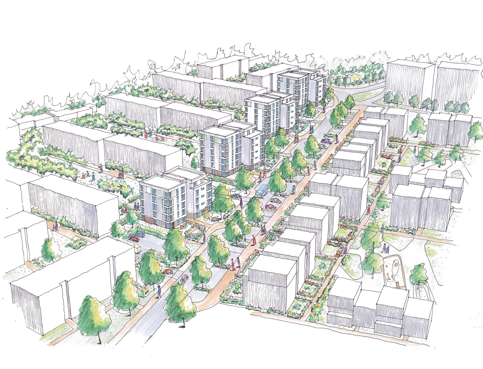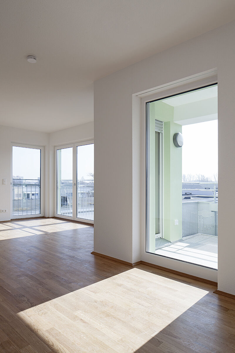 Die vier neuerrichteten Punkthäuser an der Josef-Maria-Olbrich-Straße sind bis zu sechs Geschosse hoch und verfügen über insgesamt 65, zum Teil geförderte, Wohnungen in verschiedenen Größen. Die energetisch sanierten Bestandsgebäude verfügen über 128 geförderte Mietwohnungen. Die kompakten, höhergeschossigen Gebäude verfügen über eine freundliche, sorgfältig in den städtebaulichen Kontext eingepassten Architektur. Horizontale, in Glattputz gestaltete Faschen schaffen differenzierte Fassadenansichten und geben den Gebäuden eine angenehme Maßstäblichkeit.