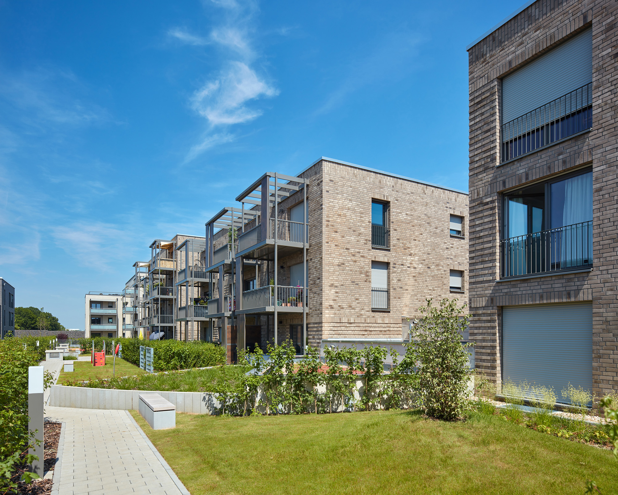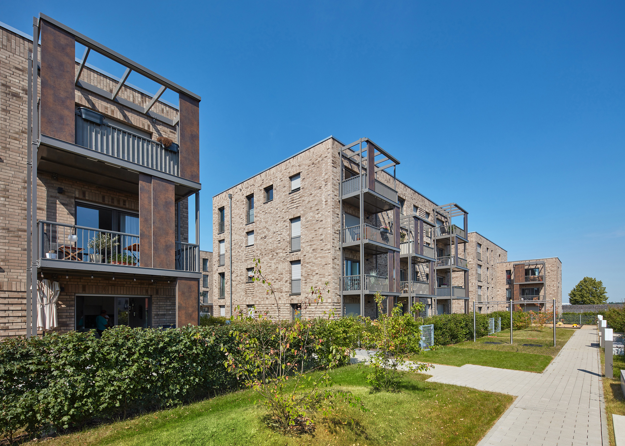 Das Quartier „Klinkerhöfe“ in Hürth-Efferen bei Köln besticht durch seine offene, städtebauliche Struktur, die gut besonnte Außenräume und vielfältige Blickbeziehungen erlaubt. Die drei- und viergeschossigen Mehrfamilienhäuser mit insgesamt 95 Wohneinheiten verfügen über einen differenzierten Wohnungsmix für Familien, Paare, Singles und Senioren.