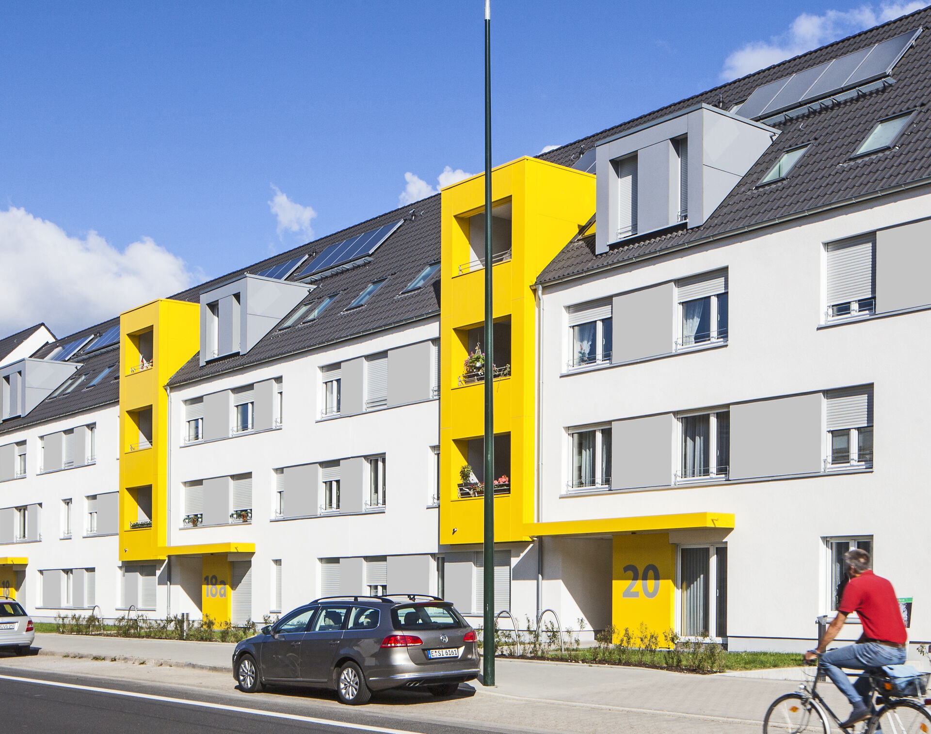 In der dreigeschossigen Zeilenbebauung im Düsseldorfer Stadtteil Lierenfeld ist förderfähiger Wohnraum in verschiedenen Größen vorgesehen: Neben familiengerechten 3-Raumwohnungen wurde eine größere Anzahl seniorentauglicher 2-Raumwohnungen geplant. Eines der Gebäude wird als Wohngruppe im Rahmen eines Wohnprojektes genutzt.
