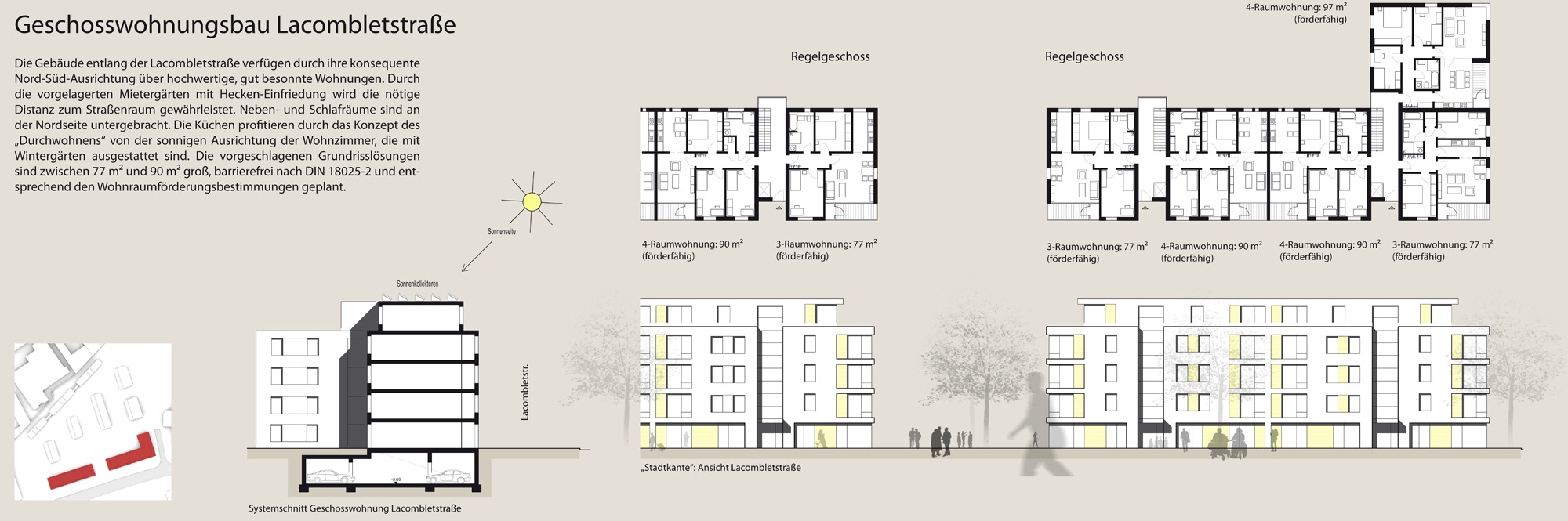 Entlang der Lacombletstraße wird durch eine straßenbegleitende, viergeschossige Bebauung die vorherrschende Gebäudestruktur aufgenommen und fortgeführt.