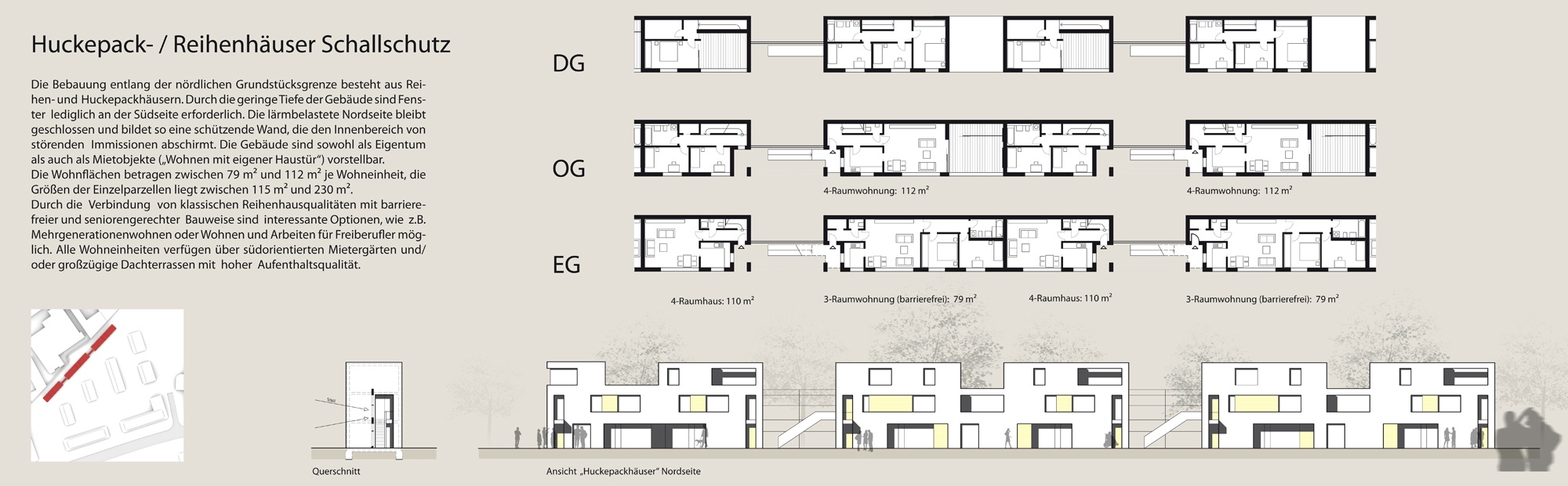 Entlang der lärmbelasteten Nordseite des Gebiets bilden sog. Huckepackhäuser einen schützenden Rücken für das Quartier. Durch ihre Gliederung reagieren sie auf die im Innenbereich vorherrschende Kleinteiligkeit, die transparenten Erschließungszonen erlauben den Durchblick auf die dahinterliegende Gehölzkulisse.