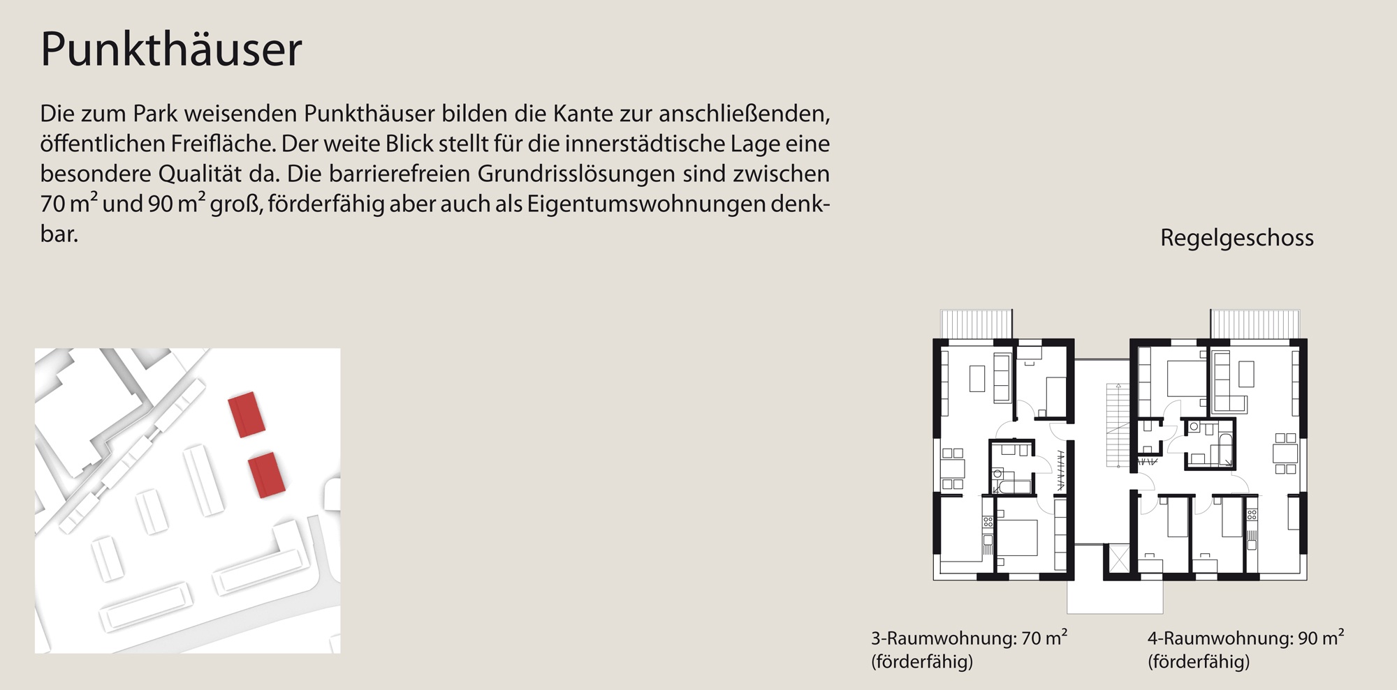 Nach Osten öffnet sich das Quartier zur anschließenden Grünfläche. Punkthäuser definieren die Grenze zwischen Wohnbebauung und Park. Durch die entstehenden, reizvollen Durchblicke ins Grüne profitiert das neue Quartier von der Weite der benachbarten Fläche.