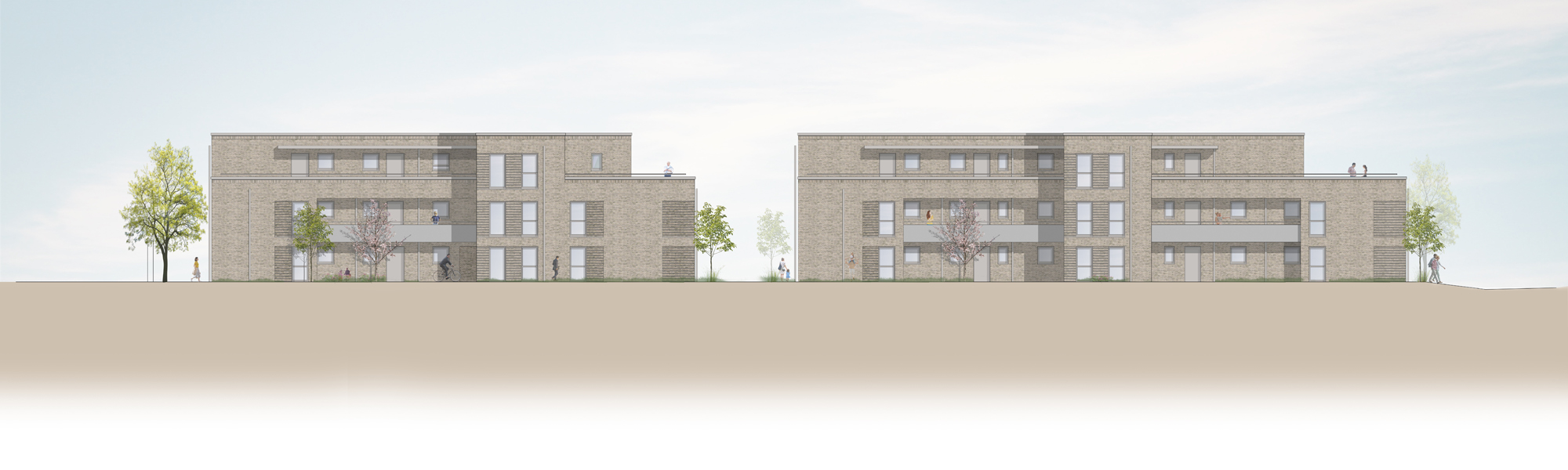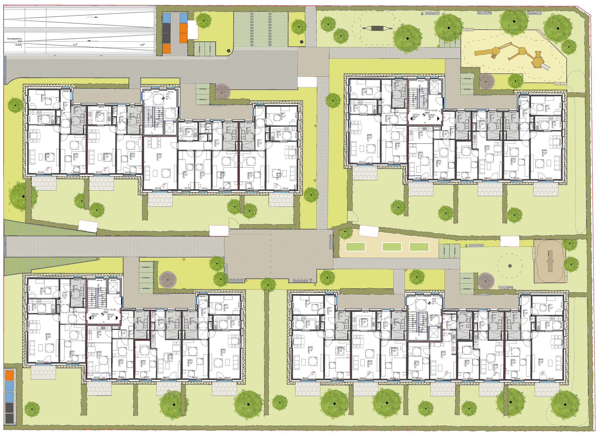 Die vier Baukörper bieten 46 barrierefreie Wohnungen in verschiedenen Größen. Durch die angeschlossene Tiefgarage ist ein hoher Anteil an nutzbarer Grünfläche möglich. Laubengänge und Mietergärten schaffen eine angenehme Verbindung zwischen Innen- und Außenraum und fördern die Kommunikation innerhalb des kleinen Quartiers.