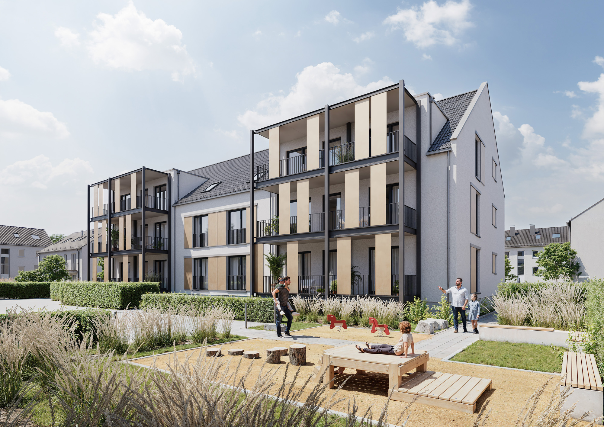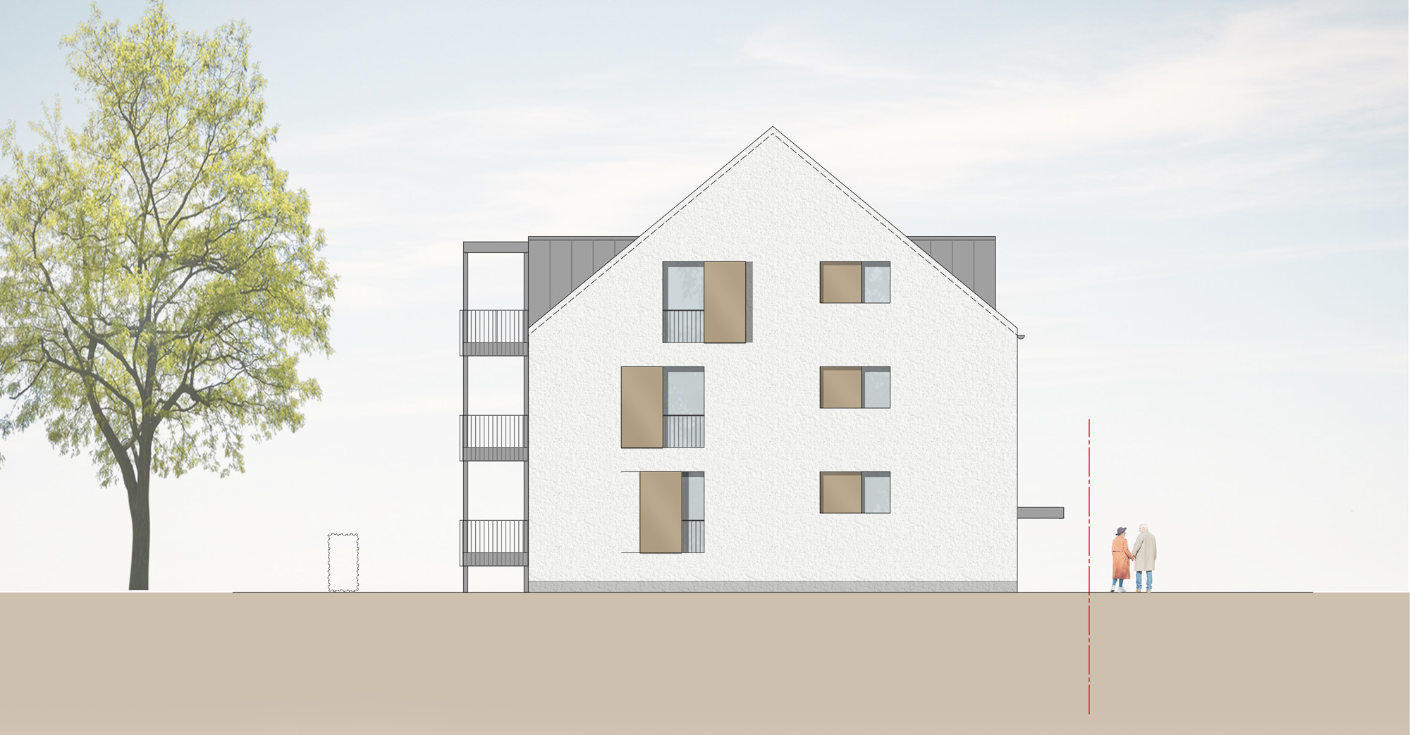 Bei dem Bauvorhaben handelt es sich um den Neubau eines Mehrfamilienwohnhauses mit 12 Wohneinheiten in Holzbauweise, gefördert durch die öffentliche Wohnraumförderung NRW.