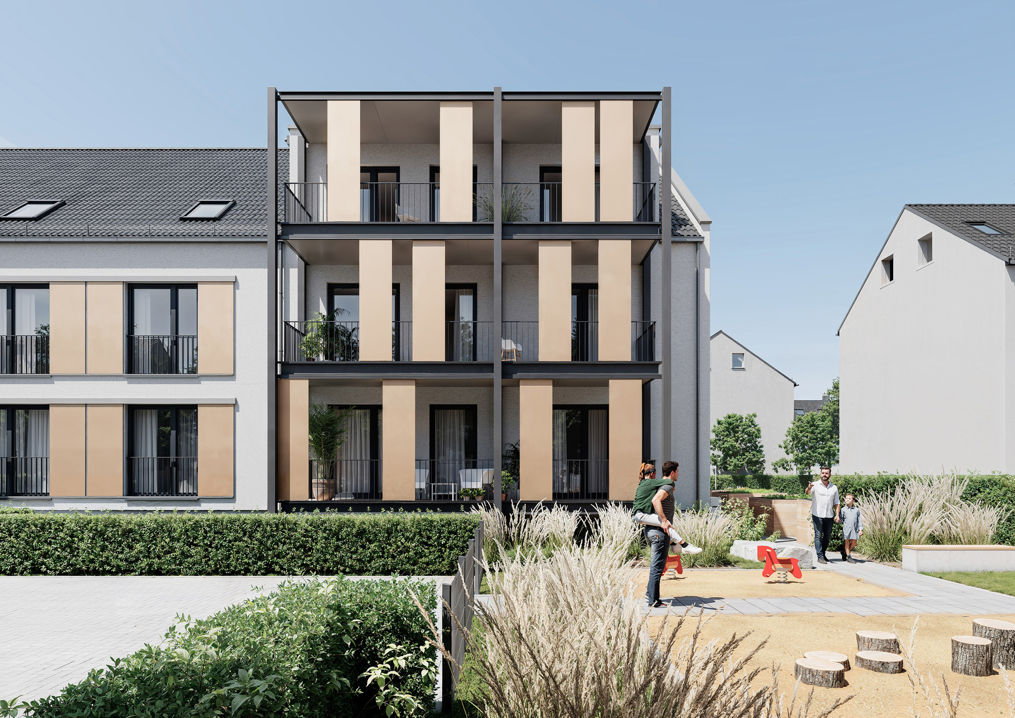 Das Konzept des Gebäudes beruht auf einer einfachen, leicht addierbaren Grundstruktur.  Als klassischer Vierspänner konzipiert bietet der Haustyp attraktive Grundrisse bei einem günstigen Verhältnis von Nutz- zu Wohnfläche. Durch seine kompakte, termische Hülle kann der KfW-40-Standard mühelos erfüllt werden.