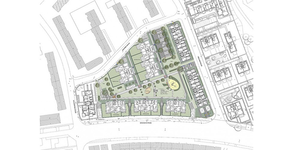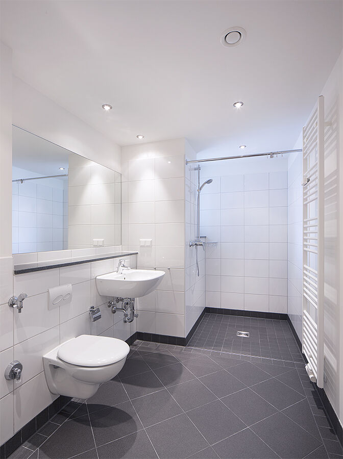 Insgesamt entstanden 105 Mietwohnungen, davon 27 Einheiten mit öffentlicher Förderung. Der ruhende Verkehr ist überwiegend in einer Tiefgarage untergebracht.