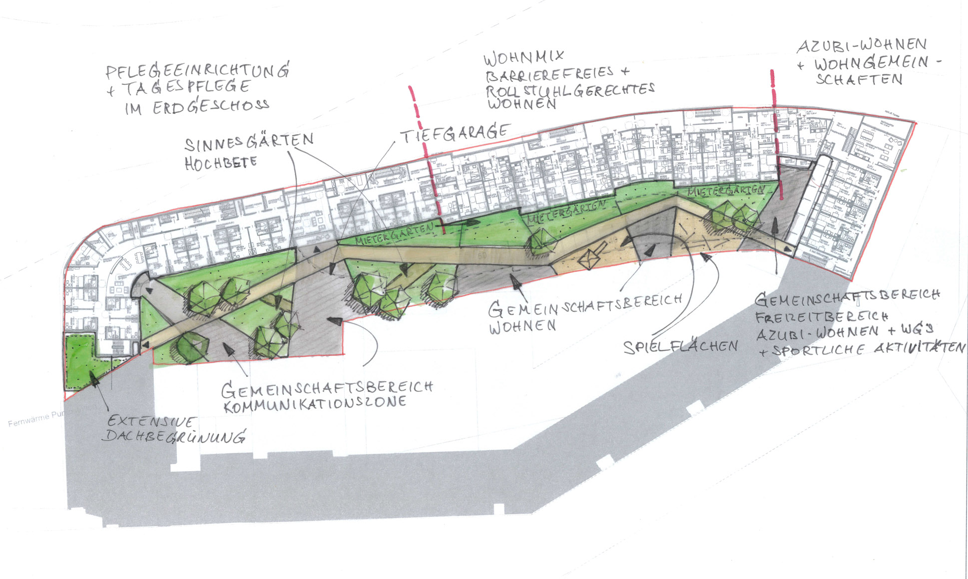 Die Ausschreibung sah ein innovatives Wohn- und Pflegekonzept für Senioren mit stationären, teilstationären und ambulanten Pflegeangeboten, öffentlich geförderte Wohnungen sowie Auszubildendenwohnen vor.
