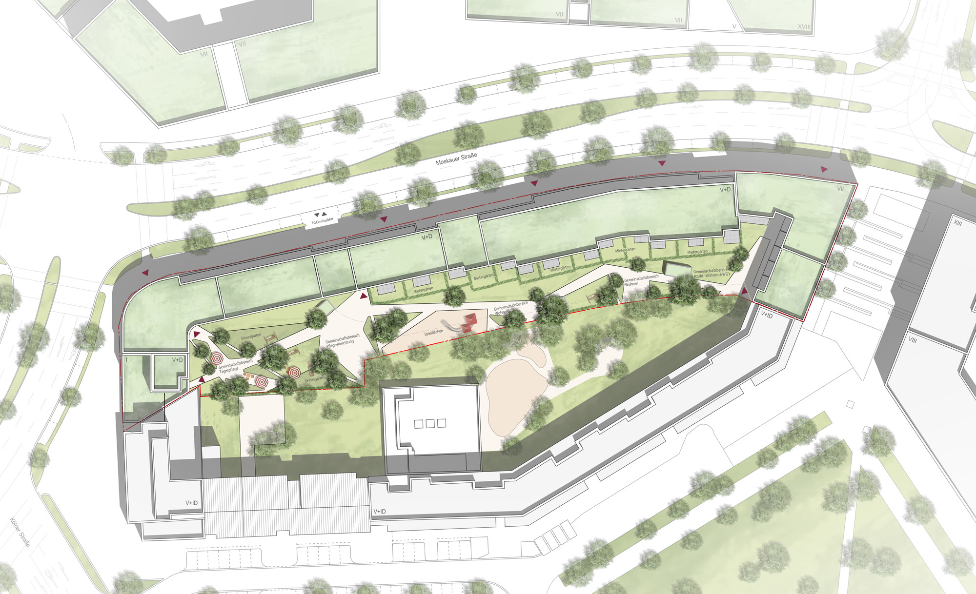 Anknüpfend an die durch Großformen geprägte Umgebung wird eine geschlossene, klar strukturierte Baukörperstruktur vorgeschlagen, die eine eindeutige Zonierung von öffentlichen und privaten Bereichen vorsieht. Der lebendige Straßenraum ist klar getrennt und ermöglicht einen geschützten, grünen Innenhof, der, in Kombination mit Schallschutzgrundrissen, hochwertiges, innerstädtisches Wohnen ermöglicht.